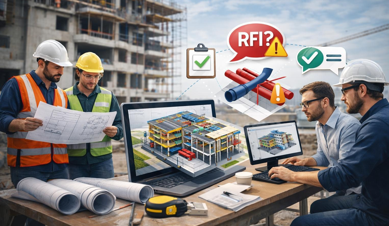 RFIs spike when trade contractors make field decisions without design team input because they cannot get a timely answer. BIM coordination changes the timing of those conversations. When coordination issues are identified and resolved in weekly model review sessions — before construction — the field team has answers already embedded in the coordination drawings. The question never becomes an RFI because it was already answered.
