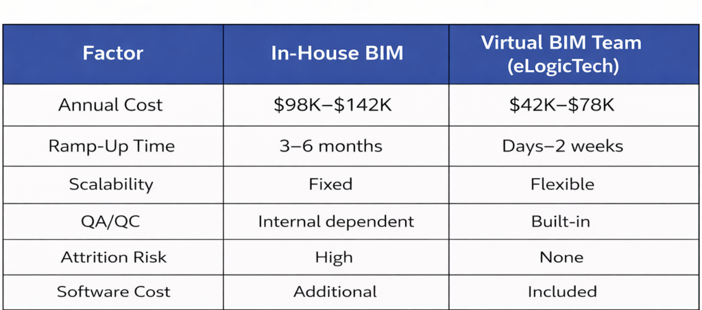 Outsourcing BIM vs Hiring In-House | Cost Breakdown for AEC Outsourcing BIM vs Hiring In-House: Real Cost Breakdown for US AEC Firms The Decision That Impacts Project Margins Every growing AEC firm hits this point: A new project lands. Coordination complexity increases. Your internal team is already stretched. Now the decision: • Hire in-house BIM staff • Or extend your team with a virtual BIM partner Most firms default to hiring. It feels safer. But financially and operationally—it’s often the wrong move. What Hiring In-House BIM Actually Costs (Beyond Salary) Most firms assume BIM hiring is a $75K decision. It’s not. Real Annual Loaded Cost (US AEC Market) • Base Salary → $65K–$85K • Taxes + Benefits → $15K–$25K• Software + Hardware → $5K–$10K• Hiring + Training → $7K–$15K Total Actual Cost → $98K–$142K per year Hidden Operational Risks • 3–6 months ramp-up delay • Project deadlines pushed into DD/CD phases • Senior team pulled into support instead of coordination • Hiring failure → restart cycle mid-project This is where projects start losing margin. Why Hiring Feels Safe (But Isn’t) Common belief: “In-house gives us more control.” Reality: • Control doesn’t come from location• It comes from process, QA/QC, and standards Without structured QA/QC: • Clash detection gaps go unnoticed • Model inconsistencies increase • Rework escalates late in CD stage What BIM Outsourcing Actually Looks Like (When Done Right) A structured BIM partner doesn’t replace your team. It extends it. Typical Cost Structure • Dedicated BIM resource → $3,500–$6,500/month • Project-based support → $1,800–$3,500/month • Coordination + QA/QC packages → $4,500–$8,000/month Annual Equivalent → $42K–$78K What You Eliminate • Hiring delays• Benefits & overhead • Software & infrastructure costs • Attrition risk• Ramp-up time The Real Cost Driver: QA/QC Failures (Not Labor) Most firms focus on cost per resource. Wrong metric. Actual risk driver = Rework • Industry rework impact → 5%–12% of project cost• Root cause → coordination failures Without structured QA/QC: • Errors move from SD → DD → CD• Cost multiplies at each stage Where eLogicTech Changes the Model At eLogicTech, QA/QC is not optional. It is embedded into delivery: • Discipline-specific model checks • Clash detection validation• LOD compliance verification • Constructability review cycles This ensures: • Fewer RFIs• Reduced rework • Higher coordination confidence The Scaling Problem Hiring Cannot Solve • In-house teams are built for average workload.• Projects don’t operate on average. When Pipeline Spikes • Multiple projects overlap• Deadlines compress • Coordination pressure increases What Happens Internally • Overtime increases• Quality drops • Delivery slows Virtual BIM Team Advantage • Scale up instantly for peak load• Scale down without overhead • Maintain QA/QC consistency This is how firms grow without increasing fixed cost. Side-by-Side Comparison . Addressing the Biggest Objection: Control Concern: “We lose control if we outsource.” Reality: Control comes from: • Defined BIM execution plans• Standardized deliverables• QA/QC checkpoints • Clear communication workflows A structured BIM partner integrates into your system—not outside it. Why US AEC Firms Are Shifting Firms are not outsourcing to save cost. They are doing it to: • Protect margins• Reduce hiring risk • Increase delivery capacity • Maintain QA/QC consistency eLogicTech: Virtual BIM Team Extension eLogicTech operates as: • A virtual extension of your BIM team • Embedded within your workflow • Aligned with your standards • Focused on QA/QC-driven delivery With 25+ years of AEC experience and 400+ professionals, eLogicTech supports BIM, CAD, MEP, and coordination workflows across US projects. Conclusion: The Smarter Decision Framework If your goal is: • Short-term staffing → hire• Long-term growth + flexibility → extend your team The firms scaling successfully today are not adding overhead.They are adding capacity without risk. Call to Action Planning your next BIM-heavy project? Evaluate: • Cost per resource• Time to delivery• QA/QC risk exposure Then decide. Frequently Asked Questions ❓ Q: Is outsourcing BIM cheaper than hiring? Yes. Outsourcing BIM can reduce costs by 30–50% annually while eliminating hiring, software, and overhead expenses. Q: Does outsourcing BIM affect quality? Not when QA/QC processes are embedded. Structured BIM partners often improve coordination accuracy and reduce rework. Q: How fast can a BIM team scale with outsourcing? Typically within days to 2 weeks, compared to 3–6 months hiring cycles. Post navigation Prev post: Prev PostNext post: Next Post 0 CommentsClose Comments Leave a comment Cancel replyName E-mail Save my name, email, and website in this browser for the next time I comment. Comment I agree that my submitted data is being collected and stored. For further details on handling user data, see our Privacy Policy